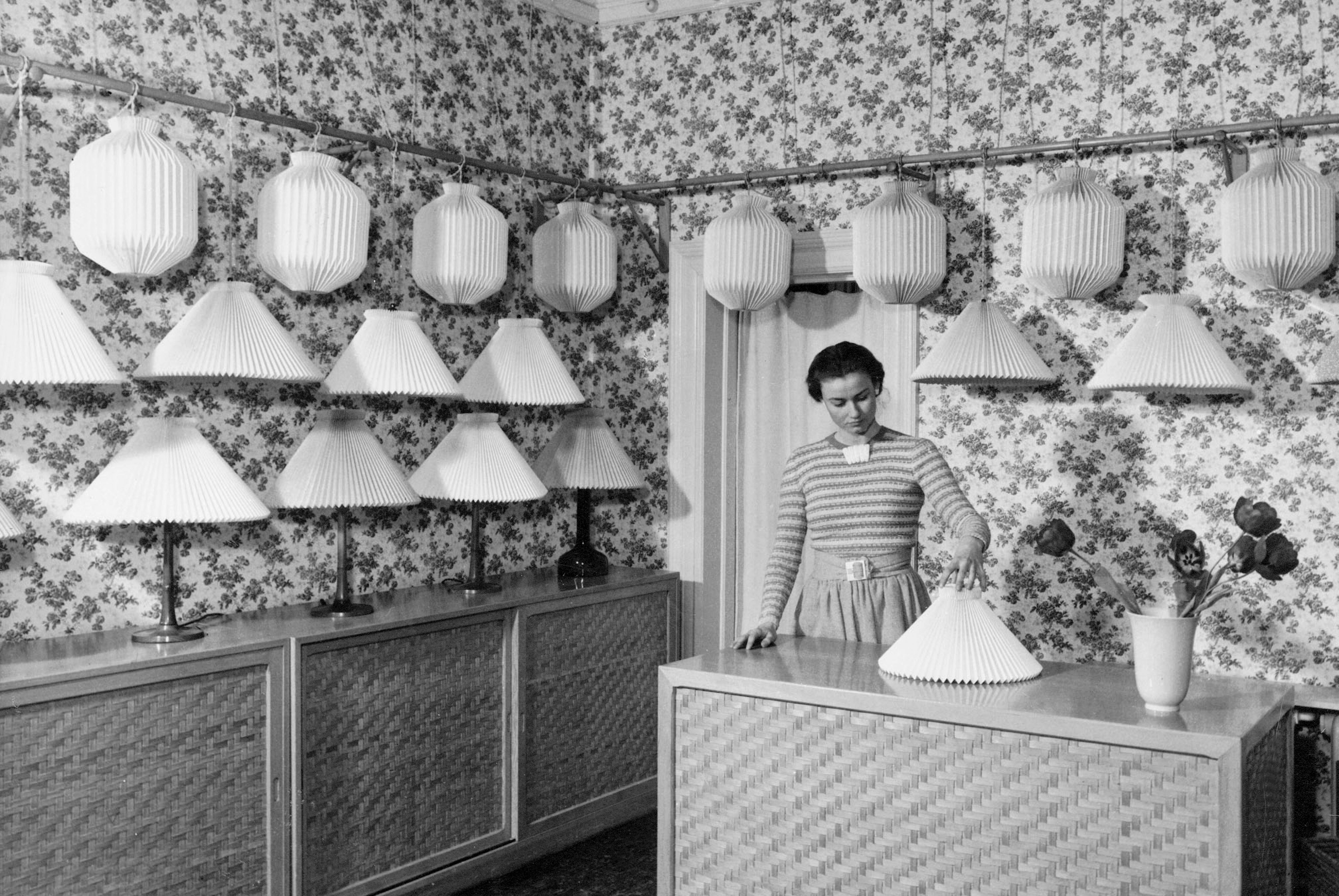 As mentioned earlier, a shop was opened in Copenhagen as early as in 1943 in which Le Klint were displayed and, of course, sold. The shop was fitted by Kaare Klint with shop furnishings in Oregon pine with wicker doors. The original fittings still exist, and are stored at the factory in Odense. The shop walls were papered with Gunnar Biilmann Petersen's flowery "rose paper" in a blue hue, which provided a counter to the simple, white, pleated lamps. The lamp fixtures were designed by Mogens Koch. It was Tage Klint's daughter, Lise Le Charlotte Klint, who was the first manager of the shop.