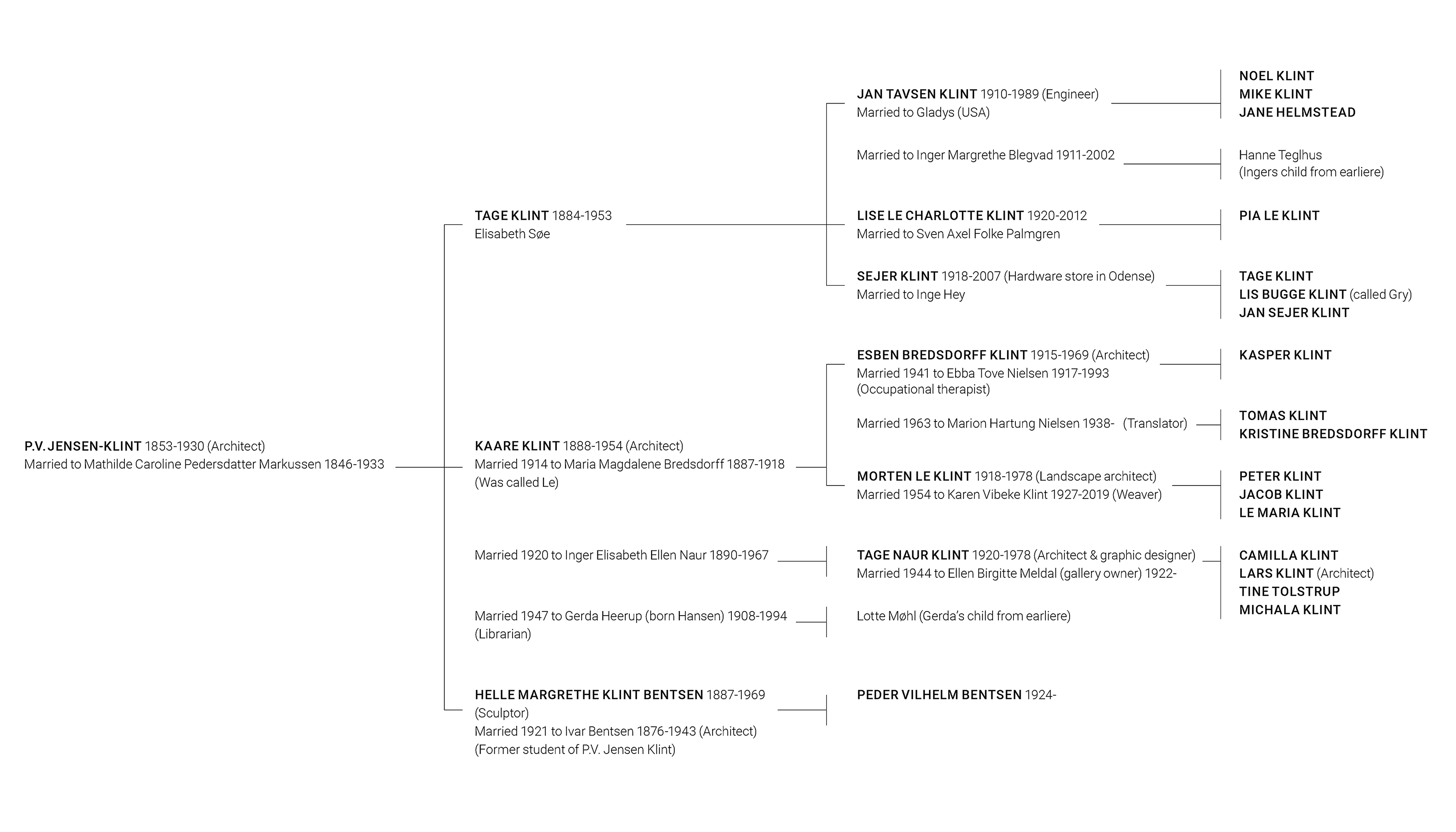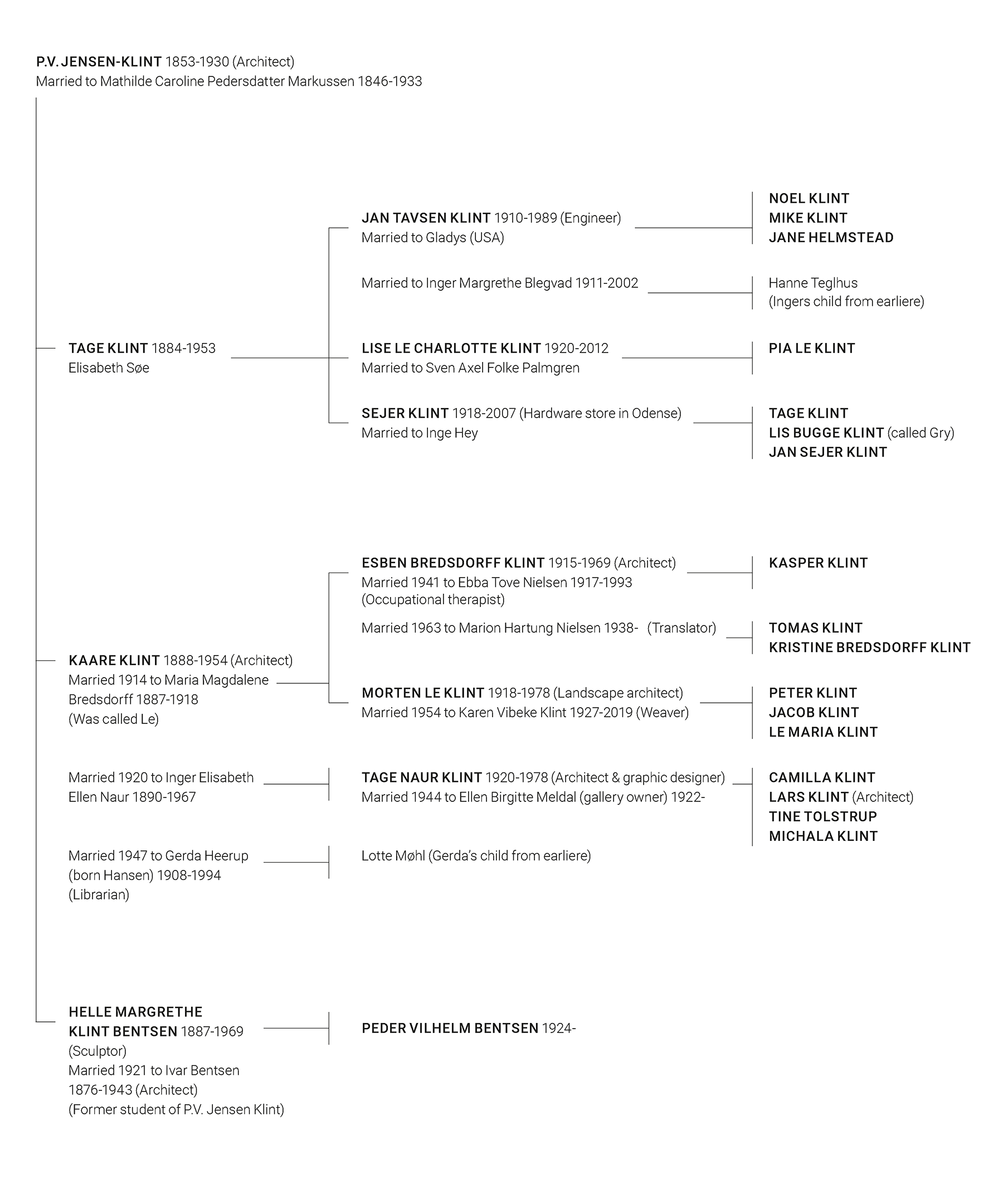 On the floor, from left to right, are Kaare Klint’s son Esben Klint; Tage Klint’s daughter Lise Le Charlotte Klint; Tage’s son Sejr Klint; and Kaare’s middle son, Morten Klint. At the very front sits Helle’s son, Peder Vilhelm, named after his grandfather, Peder Vilhelm Jensen-Klint – who most likely took the photo and is therefore not pictured.