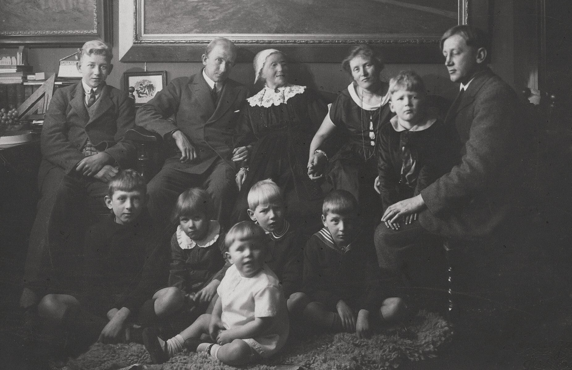 The photo shows the Klint family gathered around the parents, Mathilde and Peder Vilhelm Jensen-Klint, around 1926. In the center of the top row sits Mathilde Klint, with her son Tage Klint to the left and daughter Helle Klint to the right. On the far left is Tage’s eldest son, Jan Klint. Seated on the far right is Kaare Klint with his youngest son, Naur.
