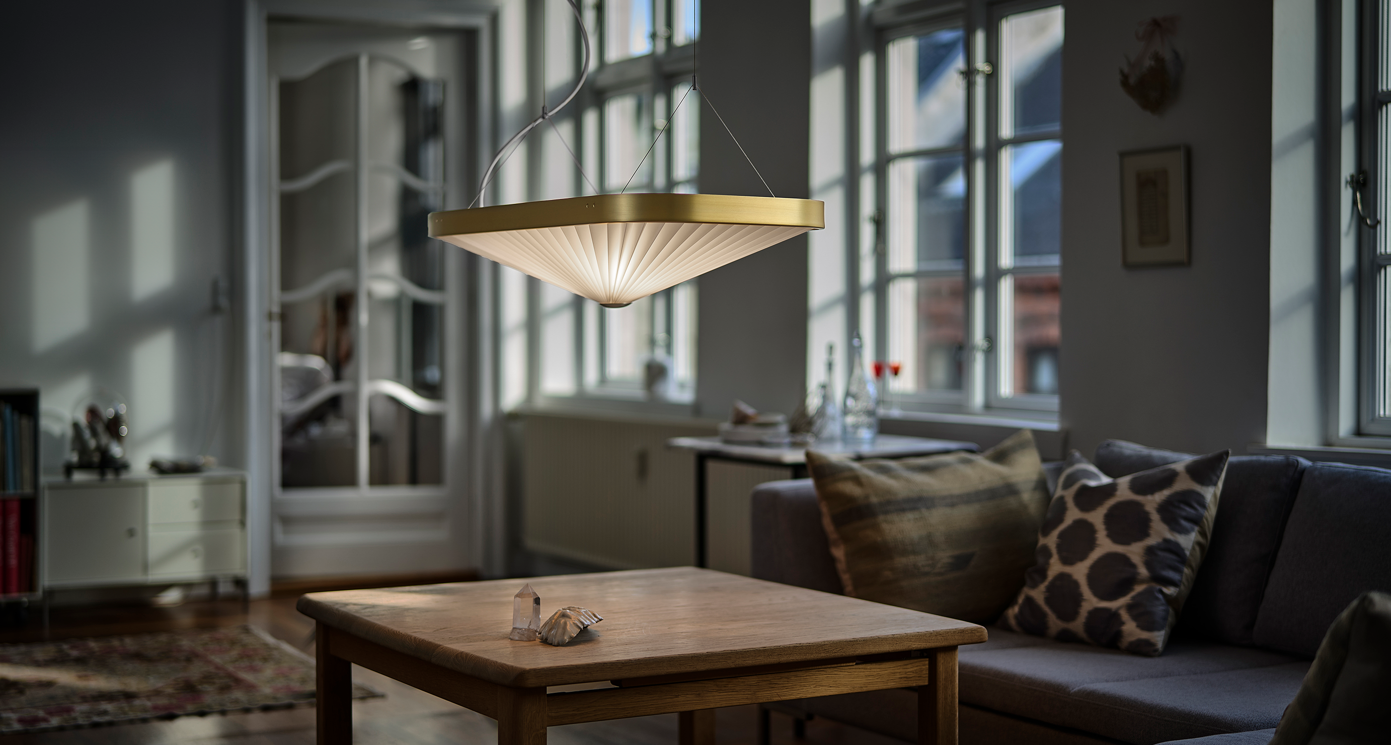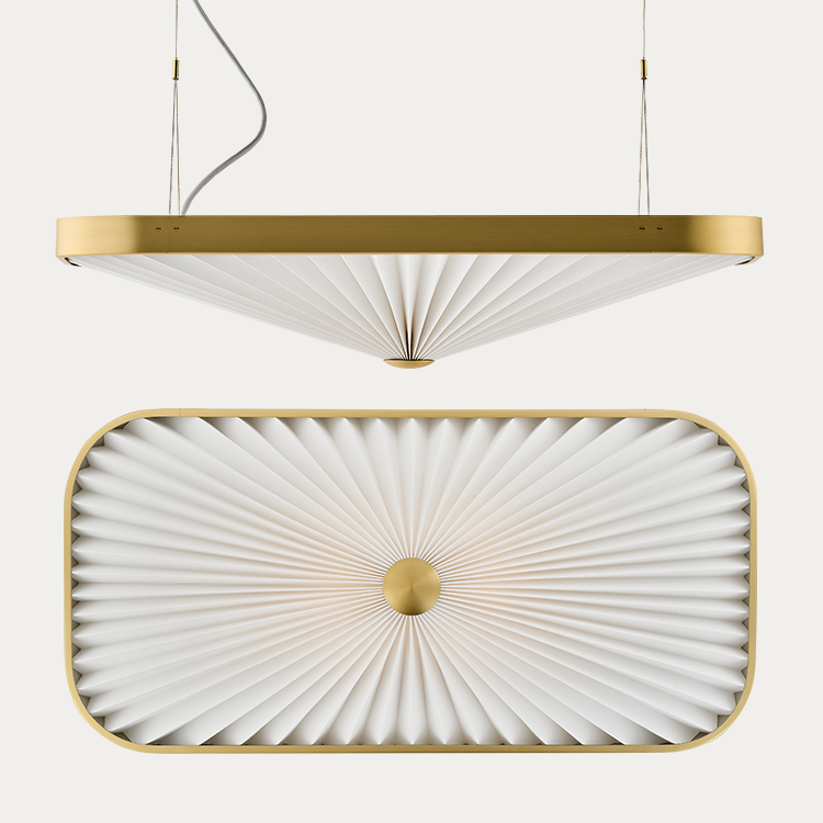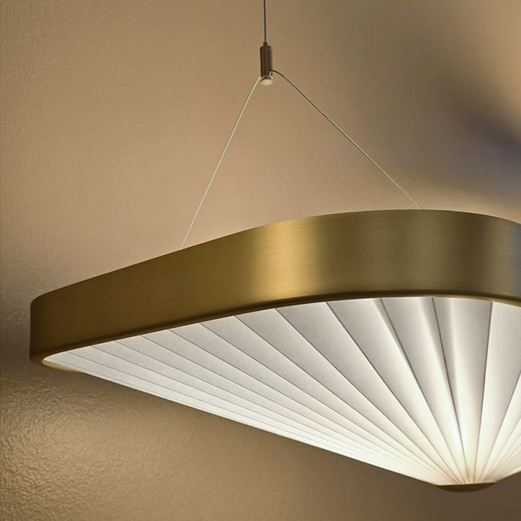 Celine is inspired by the original architecture of Designmuseum Denmark, with clean lines, bold curves, and geometric shapes. At first glance, the Celine pendant appears simple and pure, but behind this lies a complex design featuring an outer form in solid brass and a folded inner shade that mirrors the outer shape. This lighting solution is both elegant and functional, perfect for modern interiors.