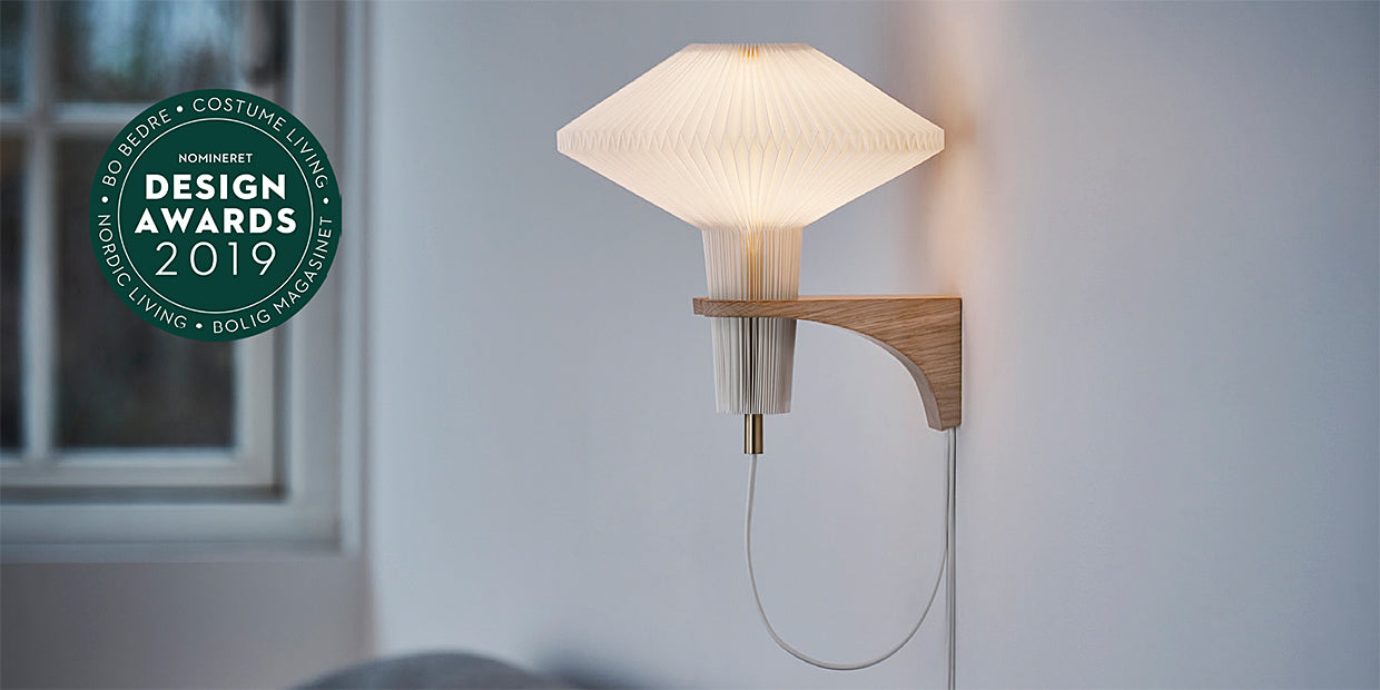 The lamp is a wall lamp with a base in untreated light oak, and the pleated shade is handmade by our folding girls in Odense. It is naturally the lamp's shape that