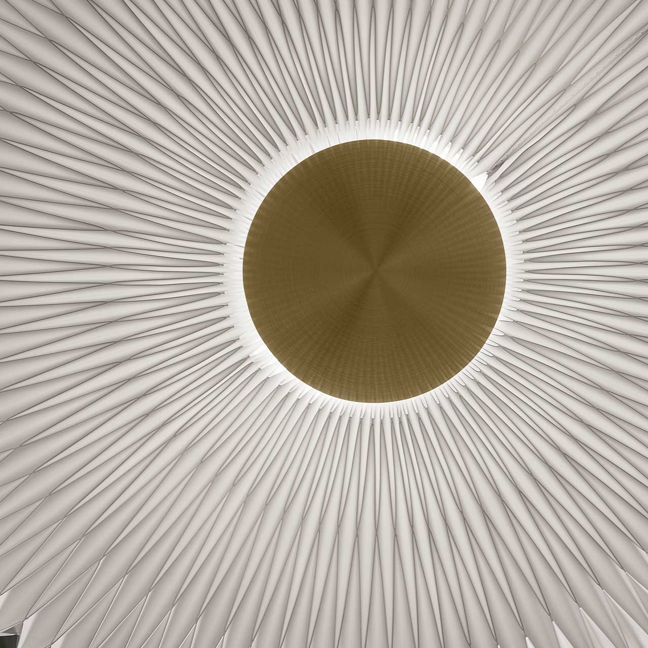 The lamp is now available in two sizes – small (Ø47 cm) and large (Ø53 cm), with a hand-folded lampshade. It is completely closed in the top and bottom with a highly polished steel plate; in the latest versions the metal details are made from brushed brass.