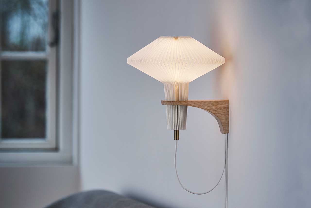 Lampen er en væglampe med en base i ubehandlet lys eg. De plisserede skærme håndlavet af vores foldepiger i Odense understreger vores DNA. Den allerførste Le Klint-lampe var netop en plisseret lampeskærm foldet i hånden.